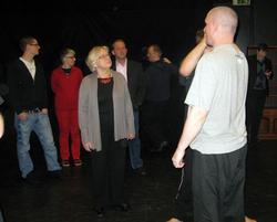 Efter fikat satte Kent igång dagens arbete med Stagefighting. Han började med lite uppvärming med kull, namnövning i ring och spegelövning.