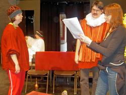 Efter fikat kom Lasse som är fritidsledarkonsulent inom LSS fritid-Köping. Han var med oss hela dagen för att se hur långt vi kommit. Lasse kommer att ha en roll i pjäsen och kommer att var med och träna längre fram. Under dagen kom även vår vikarie för Maria och var med när vi repade. Kristina Snow heter hon och har varit och tränat röst och sång med oss tidigare. Sista timmen hade vi även besök av referens- och samverkansgruppen som var inbjudna att se några repetionsscener. På förmiddagen repeterade vi nästan hela pjäsen. Alla hjälptes åt att plocka fram scenografi och kläder. Vi börjar få rutin på det nu. Vi använde också ljus och musik när vi repade.