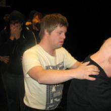 Först fick vi göra en rörelsekull - den som blev tagen var tvungen att göra en rörelse och kunde bara bli räddad om någon annan härmade rörelsen. Efter det var det en koncentrationsövning - Leda blind, där vi två och två provade på att leda varandra samtidigt som den ena i paret blundade. Det blev riktig hög koncentration i rummet.