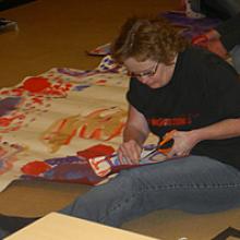 Petra och Sofie målar scengolvet