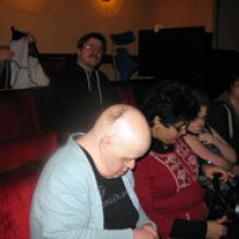 Totalt var vi nitton personer som åkte. Förutom 14 änglar och Carina och Maria hade vi bjudit med Lasse Ohlsson, Kalle Wiklund och Karin Hedvall. Föreställningen hette "Mig äger ingen" och bygger på Åsa Linderborgs roman om sin uppväxt med en alkoholiserad pappa i Västerås. Emsamblen som spelade var Teater Västmanland. Det var en fantastisk föreställning och vi var flera som både grät och skrattade. Vi blev så tagna och berörda att vi glömde bort att fotografera. Vi hann med att ta tre bilder innan föreställningen började men mera än så blev det inte. Men de är väl högsta betyg på en uppsättning att man blir så pass uppslukad av den att man glömmer omvärlden.