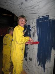 Jonathan och Mikael i målartagen, grå tunnel blir blå.