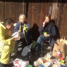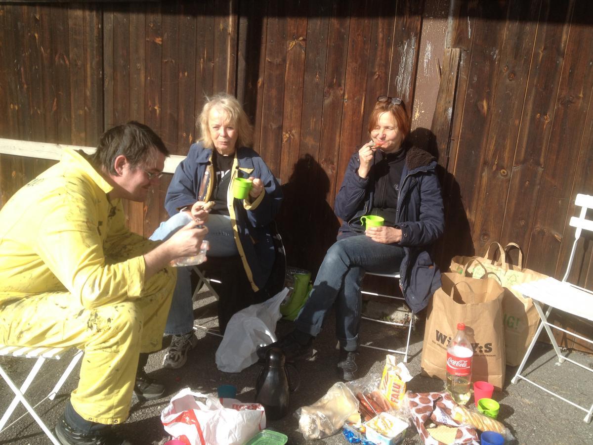 Så fort det blev lite varmare startade vi igen arbetet med att iordningställa scenen. Vi tillbringade ett antal söndagar i paken och flera av Änglarna kom och hjälpte till att måla och fixa. Kallt om fingrarna var det ibland så in i bomben - iskalla händer fulla av färg. Även vissa fredagar gick vi till parken för att fixa och måla.