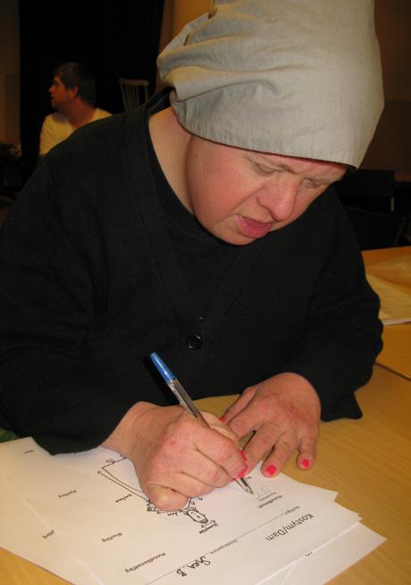 Dagen började med en mjuk uppvärmning, vi rörde oss till lugn och avslappnande musik. Efter den övningen ställde vi oss rygg mot rygg med en partner och sedan fick vi beskriva den andres kläder utan att se på varandra. Sedan blev det en ordentlig kull till Fame musik. När vi skulle gå på fika kom Lillemor Quist som är ny förvaltningschef inom Vård och omsorg. Lillemor har inte sett verksamheten tidigare, men hon såg vår föreställning Trettondagsafton. Lillemor var med under förmiddagen och såg när vi repade, vilket vi uppskattade väldigt mycket. -