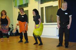 Efter fikat kom Susan Fredriksson, vår danspedagog som vi anlitat för att bland annat hjälpa oss med dansen till Lasse-Maja. Susan jobbar vanligtvis på Carlforska gymnasiet i Västerås som balettpedagog hon har också gruppen Draothea en förmiddag i veckan samt leder dansgruppen Dans syndrom. Dagen till ära hade Maria och Carina bytt om till danskläder och visade upp SINA Kunskaper för gruppen ..... -
