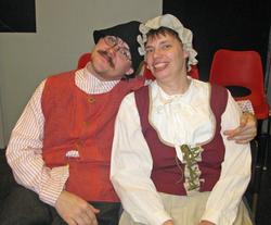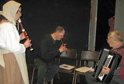En solig morgon och spänd förväntan. Idag skulle våra musiker komma och testa sångerna. Innan de kom hann vi att prova några nya kläder som sygruppen hade sytt i tisdags! Det är så spännande Att se hur allt växer fram, en liten bit i taget. Vid fikat kom Fritz Carlsson som spelar dragspel och Tomas Winther som spelar flöjt och klarinett. Det lät faktiskt riktigt bra för att vara första gången vi provade med musik, men det blev några omtagningar innan de rätta tonerna satt. Tomas och Fritz stannade hela förmiddagen och kommer att vara med nästan alla gånger innan premiär. Efter fikat jobbade vi med dansen Susan lärde oss förra gången. Oj oj oj .... taktsinne är väl kanske Inte vår starkaste sida. Tur att vi filmade så vi kunde se alla turer. Göran och Malin var de som kom ihåg mest av oss alla! -